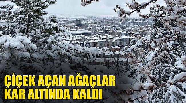 Afyonkarahisar'da dün yaşanan yoğun kar yağışı sonrası kent adeta beyaz bir örtü ile kaplanırken, yalancı baharı aldanıp çiçek açan ağaçlar ise kar altında kartpostallık manzara oluşturdu.