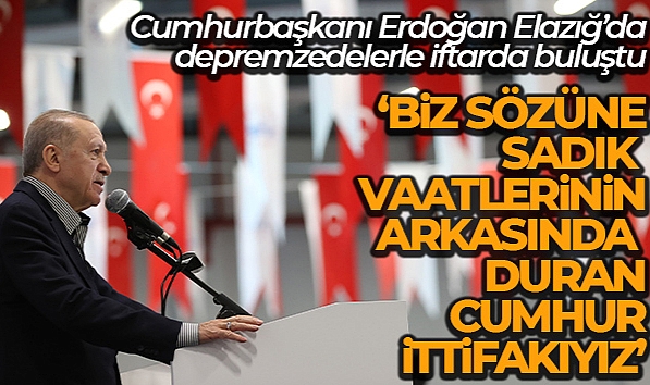 Cumhurbaşkanı Recep Tayyip Erdoğan, Elazığ afet konutları temel atma ve sosyal konutlar anahtar teslim töreninin ardından depremzedelerle birlikte iftar yaptı. İftar sonrası açıklamalarda bulunan Cumhurbaşkanı Erdoğan, hem deprem konutlarının binlercesini teslim ettiklerini hem de Ramazan sevincini afetzede kardeşleriyle yaşadıklarını kaydetti. Cumhurbaşkanı Erdoğan, "Bugün Allah kabul etsin 10. orucumuzu tutuk. Hem deprem konutlarımızın binlercesinin temelini attık hem de Ramazan sevincini afetzede vatandaşlarımızla yaşadık. Soframızı şenlendirdiğiniz için hepinize teşekkür ediyorum. İftar sofrası birliğimizi beraberliğimizi, kardeşliğimizi doya doya teneffüs ettiğimiz bir muhabbet sofrasıdır. Rabbim bu soframızın bereketini artırsın. Bu sofranın etrafında buluşan gönüller için maddiyatın, makamların, unvanın, zengin ya da fakir olmanın hiçbir kıymeti harbiyesi yoktur. Ülkemizin dört bir yanında milletimizin iftar sofralarını komşularından ve yakınlarından başlayarak fakir fukaraya açtığını görüyoruz. Özellikle asrın felaketiyle mücadele ettiğimiz bu zor günlerde insanımız yardımlaşmanın kitabını adeta yeniden yazıyor. Öyle ki hayırseverlerimiz bu Ramazan her zamankinden daha cömert, vakıf ve derneklerimiz bu sene her zamankinden daha aktif, belediyelerimiz nerede bir muhtaç varsa elinden tutmanın ihtiyaçlarını gidermenin derdinde. Devletimiz ilgili kurumları yaraları sarmak için olağanüstü çaba harcıyor. 85 milyonun tamamı dünyada başka hiçbir millete nasip olmayacak bir şuurla hamdolsun depremzedelerimizin yüküne omuz veriyor. Milletçe 6 Şubat sabahı sadece kendi tarihimizin değil insanlık tarihinin en tabii afetlerinden birine uyandık. Kahramanmaraş merkezli 7,7 ve 7,6 şiddetindeki depremler, Elazığ'ın da arasında bulunduğu 11 ilimizde yıkıma ve can kaybına yol açtı. Sizlerin şahsında Elazığlı vatandaşlarımızın hepsine geçmiş olsun diliyorum. Depremde hayatını kaybeden 50 bini aşkın vatandaşımızın her birine Allah'tan rahmet diliyorum. Hem yaşadığımız felaketin büyüklüğünü hem de yitip giden canlarımızın yüreğimize düşürdüğü ateşi tarif etmekte kelimeler yetersiz kalıyor. Ne yaparsak yapalım gidenleri geri getiremeyeceğimizin farkındayız. Ama aynı şekilde can kayıpları dışında diğer kayıplarımızın telafi etmenin mümkün olduğunu da çok iyi biliyoruz" diye konuştu.