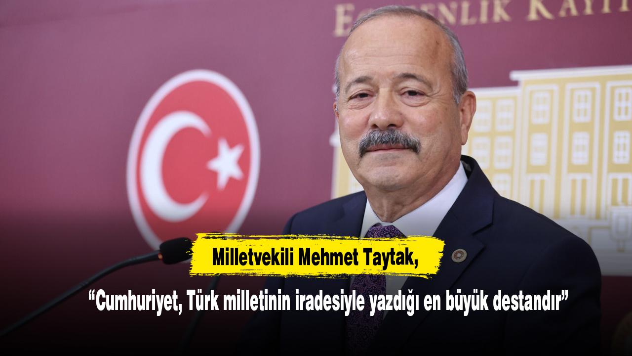 Milletvekili Taytak, Cumhuriyet’in, Türk milletinin şanlı tarihinden aldığı güçle esareti reddedip kendi kaderine sahip çıktığı bir kahramanlık destanı olduğunu ifade ederek, “Cumhuriyet; Türk milletinin şanlı mazisinden aldığı güçle esareti reddettiği, kendi kaderine sahip çıktığı bir kahramanlık destanıdır. Gazi Mustafa Kemal Atatürk’ün önderliğinde kurulan Cumhuriyet, milletimizin hür iradesinin, inancının ve istiklaline olan bağlılığının en açık tezahürüdür. umhuriyetimizin 102. yıl dönümünü kutlarken, bizlere bu kutlu mirası emanet eden başta Gazi Mustafa Kemal Atatürk olmak üzere, aziz şehitlerimizi ve gazilerimizi rahmet, minnet ve şükranla anıyorum. Türk milleti, Cumhuriyet’in değerlerini sonsuza dek yaşatacak güç ve iradeye sahiptir. Cumhuriyet, sadece bir yönetim biçimi değil; Türk milletinin yeniden dirilişidir. Milliyetçi Hareket Partisi olarak, bu aziz emaneti korumak, güçlendirmek ve gelecek nesillere onurla devretmek en büyük görevimizdir. Milletimizin kaderini tayin eden bu büyük günün ruhuna sahip çıkmak, her Türk evladının vatan borcudur.” dedi
