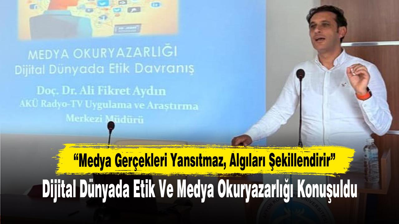 Afyon MYO Konferans Salonunda gerçekleştirilen Radyo Televizyon Uygulama ve Araştırma Merkezi Müdürü Doç. Dr. Ali Fikret Aydın’ın konuşmacı olarak katıldığı söyleşide; dijital çağda medya okuryazarlığının ve etik davranışın önemine vurgu yapıldı. Bilgiye erişimin hızla artmasıyla birlikte, bireylerin medyadan gelen mesajları eleştirel bir gözle değerIendirmesi gerektiğini belirten Aydın, “Medya çoğu zaman gerçekleri olduğu gibi yansıtmaz; bireylerin düşünce ve algılarını biçimlendirir. Bu nedenle dijital dünyada etik sorumluluk, her zamankinden daha fazla önem taşımaktadır” ifadelerini kullandı. Aydın, ayrıca söyleşide; dezenformasyon, sahte haber, dijital mahremiyet ve sosyal medya etiği konularına da değindi.