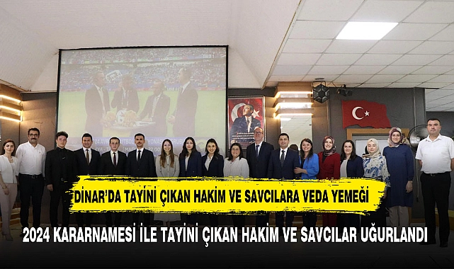 Hâkimler Savcılar Kurulu’nun (HSK) Adli ve İdari Yargı 2024 Yılı Kararnamesi ile Dinar Cumhuriyet Savcısı iken Alaşehir Cumhuriyet Savcılığına atanan Mahmut Şahbaz, Dinar Cumhuriyet Savcısı iken Nusaybin Cumhuriyet Savcılığına atanan Adil Furkan Uğur, Dazkırı Cumhuriyet Savcısı iken Erzincan Cumhuriyet Savcılığına atanan Gaye Yazıcı, Dazkırı Cumhuriyet Savcısı iken Osmaniye Cumhuriyet Savcılığına atanan İsmail Yıldızlı, Dinar Hakimi iken Ankara Hâkimliğine atanan Berna Karakuş, Dazkırı Hakimi iken Osmaniye Hâkimliğine atanan Sertaç Şentürk, Dazkırı Hakimi iken Turgutlu Hâkimliğine atanan Seda Yurdakul ve Dinar Cezaevi Müdürü Erkan Bingöl, Denetimli Serbestlik Müdürü Abdurrahman Çaba ve Yazı İşleri Müdürleri için Dinar Park Âlâ Toplantı Salonunda veda mahiyetinde bir veda yemeği verildi.