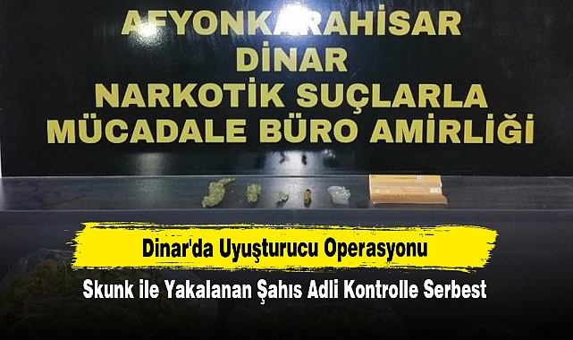 Edinilen bilgilere göre, Dinar İlçe Emniyet Müdürlüğüne bağlı Narkotik Suçlarla Mücadele Büro Amirliği ekipleri şüpheli bir şahsı takibe aldı. Ardından şahsın evine baskın düzenleyen ve aracında aramam yapan ekipler 182.8 gram skunk isimli uyuşturucu madde ele geçirdi. Olayın ardından gözaltına alınan çıkarıldığı mahkeme tarafından adli kontrol şartı ile serbest bırakıldı.
