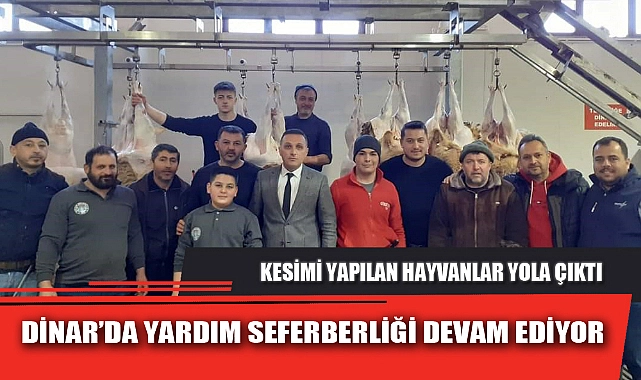 Dinar Kaymakamlığı tarafından depremzedeler için ilçede başlatılan yardım seferberliği devam ediyor. Dinar Kaymakamlığı koordinesinde devam eden yardım seferberliği kapsamında ilçede üreticilerinden bağış yapılan 70 küçükbaş 2 büyükbaş hayvanın depremzedelere kavurma yapılmak üzere kesimleri yapıldı. Kesimi yapılan hayvanlar ardından deprem bölgesine gönderilmek üzere tırlara yüklendi. >>İHA