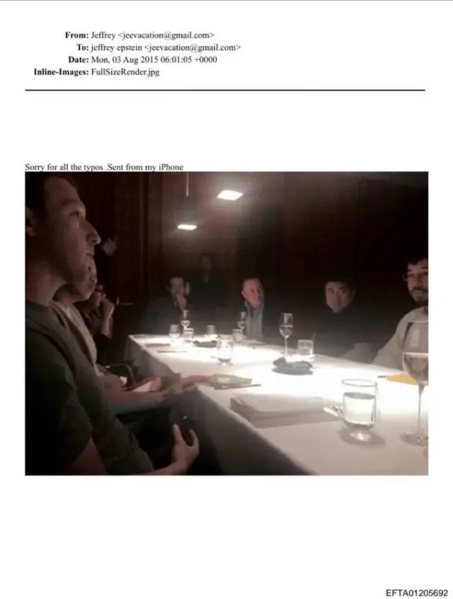 ABD Adalet Bakanlığı tarafından yayımlanan Jeffrey Epstein dosyaları arasında, 2015 yılına ait bir akşam yemeğini gösteren fotoğraf ve e-posta yazışmaları bulundu. Belgelerde, Jeffrey Epstein’ın kendisine gönderildiği belirtilen bir fotoğrafla bağlantılı e-postada, Mark Zuckerberg, Elon Musk ve Peter Thiel’in yer aldığı bir akşam yemeğine atıf yapıldığı görülüyor. Epstein, e-posta yazışmasında söz konusu yemeği “wild” (çılgın) olarak nitelendirdi.