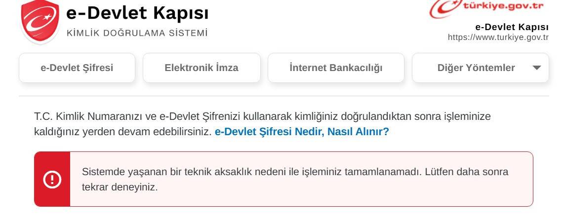 E-Devlet sistemine giriş yapmak isteyen pek çok kullanıcı, bugün “Sistemde yaşanan bir teknik aksaklık nedeni ile işleminiz tamamlanamadı. Lütfen daha sonra tekrar deneyiniz.” uyarısıyla karşılaştı. Uyarı sonrası tekrar giriş yapmayı deneyen vatandaşlar, sorunun nedenini internet üzerinden araştırmaya başladı.