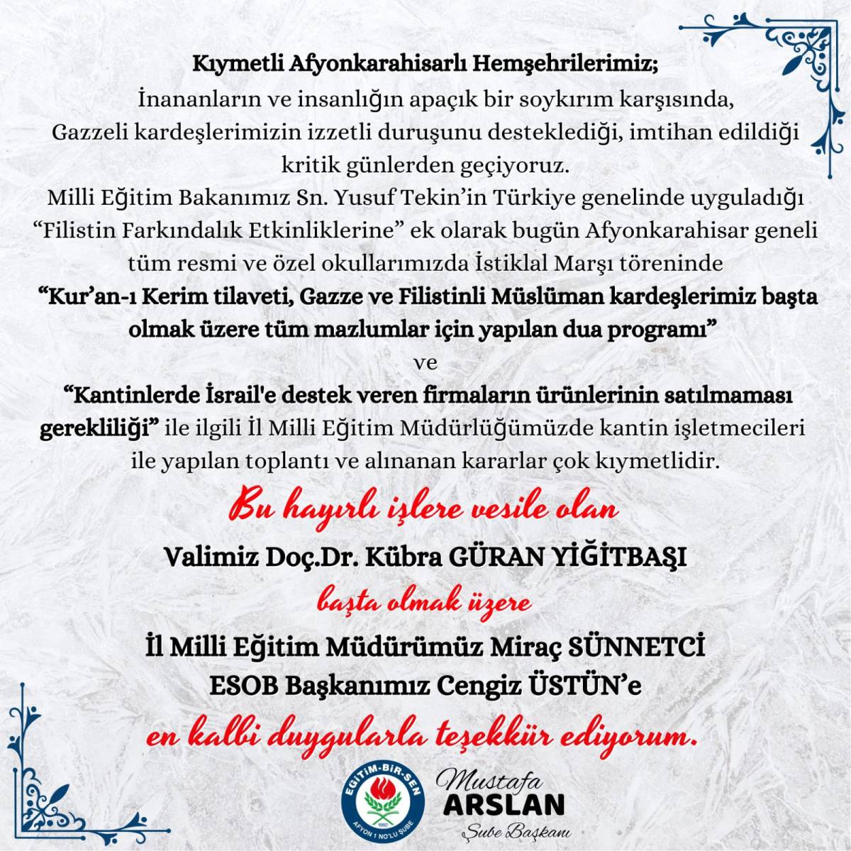 Milli Eğitim Bakanı Yusuf Tekin tarafından başlatılan “Filistin Farkındalık Etkinlikleri” kapsamında, bugün Afyonkarahisar genelindeki tüm resmi ve özel okullarda İstiklal Marşı töreni öncesinde Kur’an-ı Kerim tilaveti yapıldı.