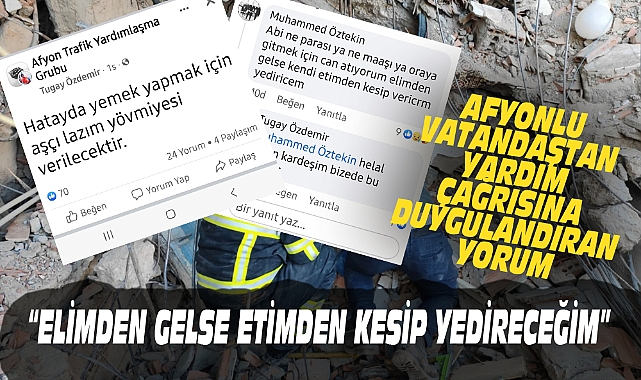 Afyonkarahisarlılar depremzedeler için seferber olurken bir hayırsever vatandaşın ücreti karşılığında aşçı arandığını sosyal medyadan belirtmesi üzerine duyarlı başka bir vatandaş “Abi ne parası ya. Elimden gelse etimden kesip yedireceğim” demesi duygulandırdı.