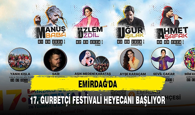 Gurbetçi vatandaşlar ve Emirdağ halkını bir araya getiren bu özel etkinlik, yine unutulmaz anılara ev sahipliği yapacak. Gurbetçi Festivali’nde, gün boyunca yer alan farklı etkinliklerin düzenlenmesinden sonra eğlence konserlerle hız kesmeden devam edecek. 26 Temmuz Cuma günü başlayacak olan konserler, 4 Ağustos Pazar Ahmet Şafak konseri ile son bulacak. Festivalde Türkiye’nin sevilen sanatçıları Manuş Baba, Özlem Özdil, Uğur Işılak ve Ahmet Şafak'ın yanı sıra birçok yerel sanatçı da sahne alacak. Festival, sadece müzikle sınırlı kalmayacak. Çocuklar ve yetişkinler için çeşitli etkinlikler, eğlenceli aktiviteler, sergiler ve lezzet durakları da festival alanında yer alacak. Hem gurbetçi vatandaşlar hem de Emirdağlılar için kültürel zenginlikleri yaşatacak birçok etkinlik düzenlenecek. Ailelerin birlikte keyifli vakit geçirebileceği, dostlukların pekişeceği ve yeni anıların birikeceği bu festival, toplumsal bağlarımızı da güçlendirecek. Her sene olduğu gibi bu sene de yaza damga vuran bir festival olacağını belirten Emirdağ Belediye Başkanı Serkan Koyuncu sosyal medya hesabından yaptığı paylaşımda; "Yaza renk katacak 17. Gurbetçi Festivalimiz için geri sayım başladı. Birbirinden güzel etkinlikler, konserler, yarışmalar ve daha neler neler…