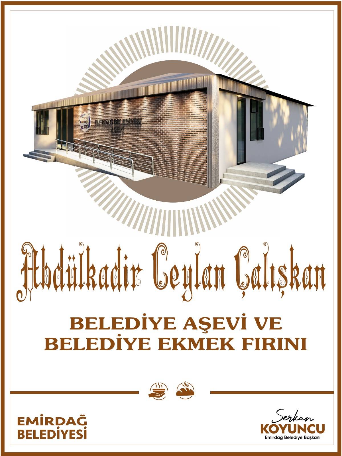 Emirdağ Belediyesi, altyapıdan sosyal projelere, kültürden spora kadar birçok alanda hayata geçirdiği yatırımlara bir yenisini daha ekledi. Belediye Başkanı Serkan Koyuncu, gönül belediyeciliği anlayışıyla sürdürdüğü hizmet atağını, yeni Aşevi ve Halk Ekmek Fırını projesiyle taçlandırıyor. “Abdülkadir Ceylan Çalışkan Belediye Aşevi ve Halk Ekmek Fırını” adıyla temeli atılan yeni tesis, Emirdağlıların sosyal yaşamına önemli katkılar sunacak.