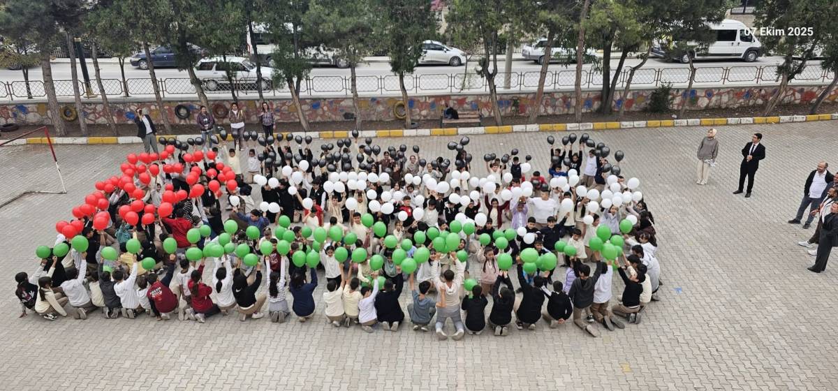Etkinlik kapsamında okul bahçesinde bir araya gelen öğrenciler, barışın simgesi olarak renkli balonlar uçurdu.