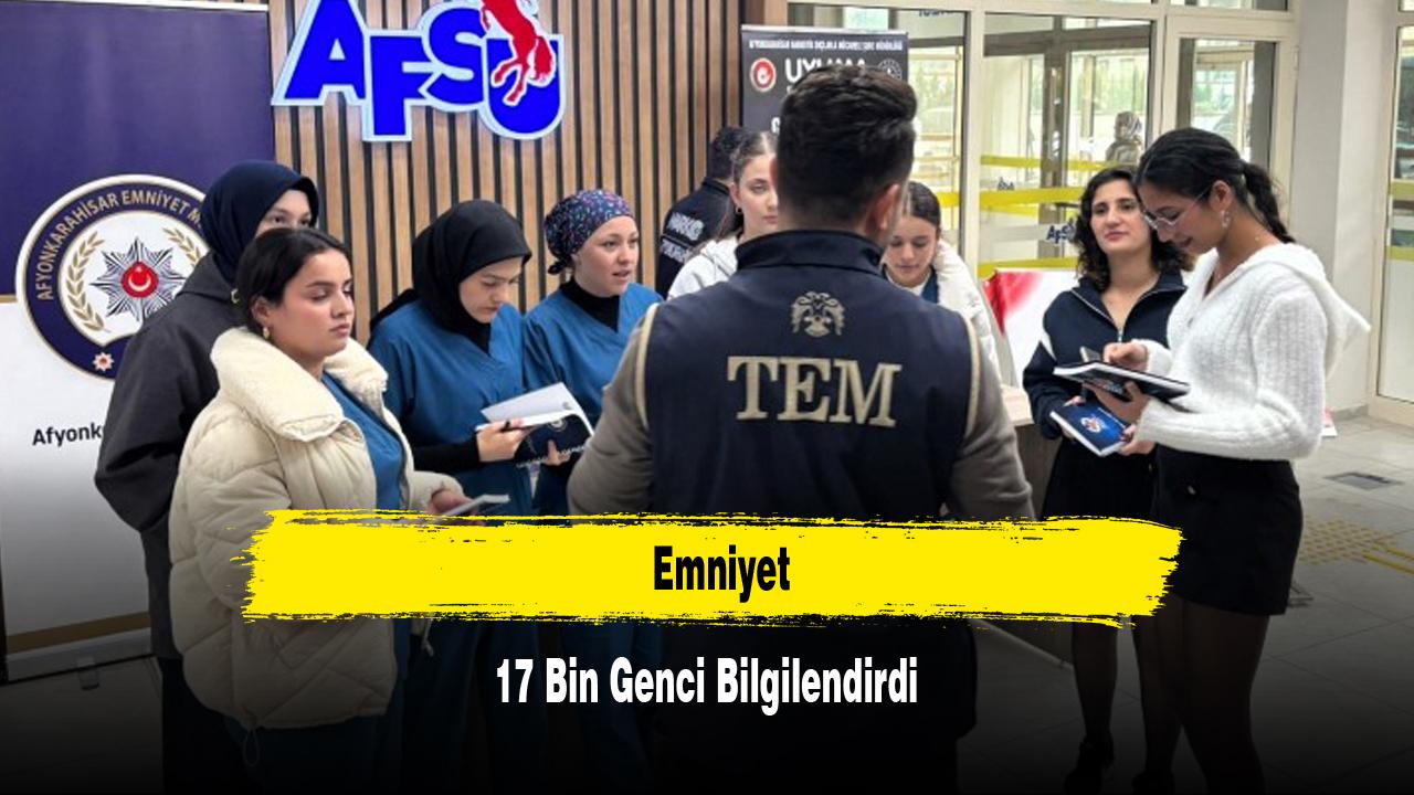 Afyonkarahisar İl Emniyet Müdürlüğü ekipleri, “El Ele Güvenli Geleceğe” projesi kapsamında Afyon Kocatepe Üniversitesi ve Afyonkarahisar Sağlık Bilimleri Üniversitesinde toplam 17 bin öğrenciye; "Terör örgütlerinin faaliyetlerine karşı farkındalık oluşturmak", "Terör örgütlerinin propaganda faaliyetleri ve yöntemleri hakkında duyarlılığı artırmak", "Uyuşturucu madde kullanımının önüne geçmek konusunda bilgilendirmek ve farkındalık yaratmak" ve "Gençlerimizin kendilerini güvende hissetmelerini sağlamak" amacıyla bilgilendirme faaliyetleri gerçekleştirdi.