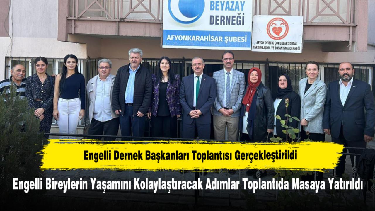 Aile ve Sosyal Hizmetler İl Müdürlüğü koordinasyonunda, Beyazay Derneği ev sahipliğinde Engelli Dernek Başkanları Toplantısı düzenlendi. Toplantıya; Çevre, Şehircilik ve İklim Değişikliği İl Müdürü Merih Karayol, Aile ve Sosyal Hizmetler İl Müdürü Bilal Erdoğan, Müdür Yardımcısı Yasin Evcin ve Şube Müdürü Fatma Özkara katıldı.