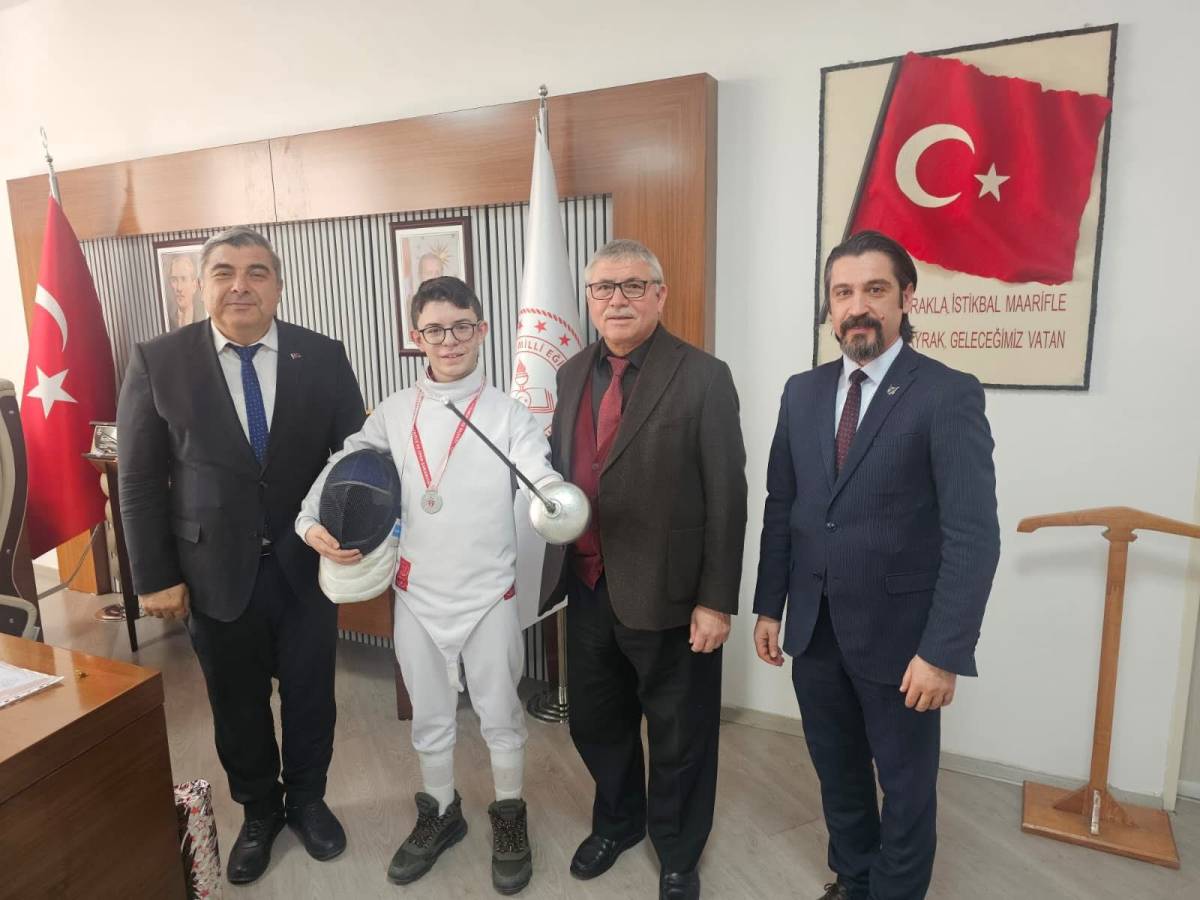 Eskrim Türkiye Şampiyonası’nda ilini başarıyla temsil eden 6. sınıf öğrencisi Alp Eren Kocakavuk, elde ettiği Türkiye ikinciliğiyle büyük gurur yaşattı. Genç sporcu, Müdür Yardımcısı Mevlüt Çınar’ın nezaretinde okul idarecileri, öğretmenleri, antrenörü ve ailesiyle birlikte İl Milli Eğitim Müdürü Miraç Sünnetci’yi ziyaret etti.