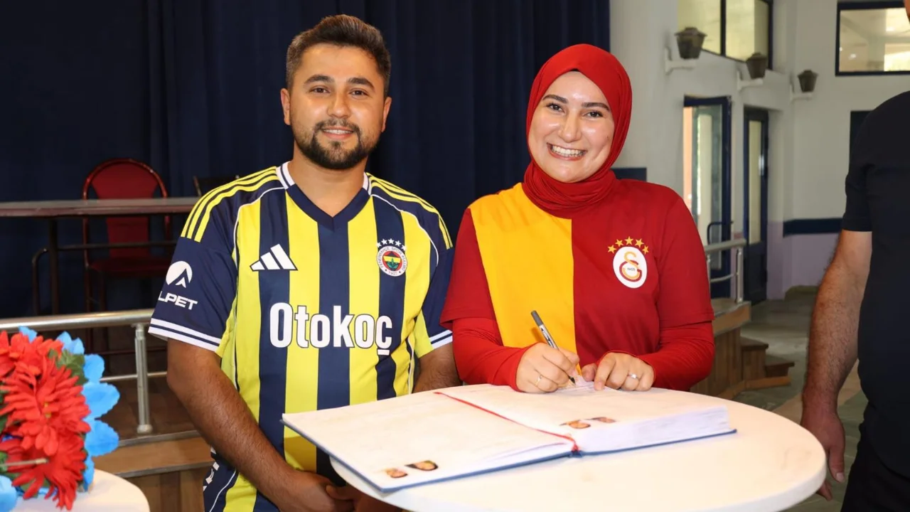 Fanatik Fenerbahçe taraftarı Öksüz ile Galatasaraylı Eser, Sandıklı Belediye Düğün Salonu'nda düzenlenen törende, tuttukları takımların formalarını giyerek nikah masasına oturdu.