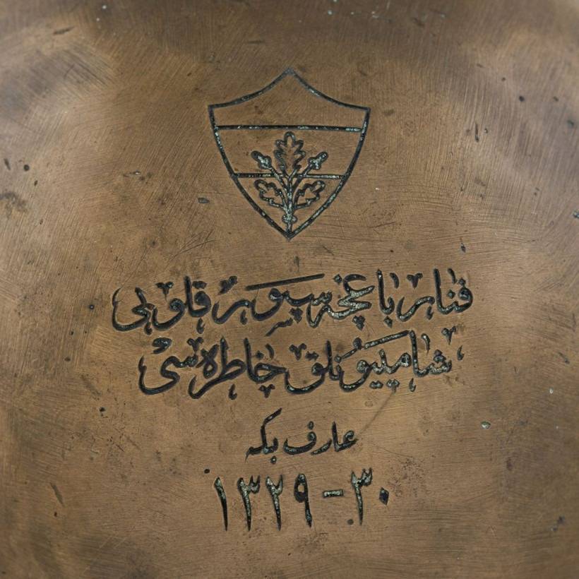 “Fenerbahçe Spor Kulübü Şampiyonluk Hatırası, Arif Bey: Hicri 1329-30 / Miladi 1911-12 tarihli. Bronz, kazıma tekniği ile tezyinli.”