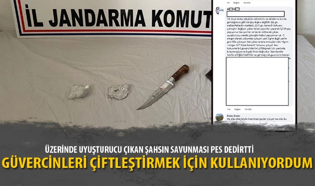 Olay sonrası sosyal medya hesabından paylaşım yaparak kendini savunan B.U., “Olay doğru değildir, üzerinde -3 gram olarak üzerimden metamfetamin çıkıyor yani 1 gram bile değil. Ayrıca aramada üstümden 6-7 tane kenevir tohumu çıktı. Tohumlarımı güvercinlerimi çiftleştirmek için yanımda bulundurdum. Bıçağı da kendi elimle jandarmaya teslim ettim” ifadelerini kullandı.