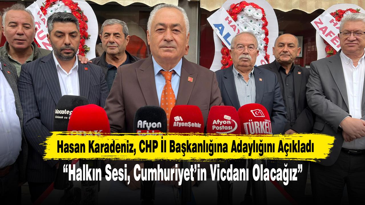Cumhuriyet Halk Partisi’ne gönül vermiş bir nefer olarak, yıllardır inandığım değerlere hizmet etmenin gururunu taşıdığını dile getiren Karadeniz, “Cumhuriyet Halk Partisi çatısı altında üye olmanın ve bu büyük ailenin bir parçası olarak iki dönem boyunca İl Yönetim Kurulu’nda İl Başkan Yardımcılığı yapmanın onurunu yaşadım. Bugün aynı inançla, aynı azimle, aynı yürekle Cumhuriyet Halk Partisi Afyonkarahisar İl Başkanlığına aday olduğumu huzurlarınızda açıklamanın gururunu taşıyorum. Değerli yol arkadaşlarım, 31 Mart 2024 yerel seçimleri sadece bir seçim değil; halkın yeniden ayağa kalktığı, inancın tazelendiği, kararlılığın güçlendiği bir dönüm noktası olmuştur. Genel Başkanımız Sayın Özgür Özel’in liderliğinde partimiz, başta İstanbul ve Ankara olmak üzere 14 büyükşehir, 21 il belediyesi ve toplamda 420 belediye kazanarak Türkiye’nin birinci partisi olmuştur. Bu büyük başarının en anlamlısı ve en gurur vereni hiç şüphesiz Afyonkarahisar’da yaşanmıştır. Yıllardır AKP’nin “sağın kalesi” olarak anılan bu şehirde Cumhuriyet Halk Partisi bir ilki başarmıştır. Dönemin partimizin Grup Başkanvekili ve Afyonkarahisar Milletvekili Sayın Burcu Köksal’ın öncülüğünde bu şehirde bir demokrasi destanı yazılmıştır.” diye konuştu.