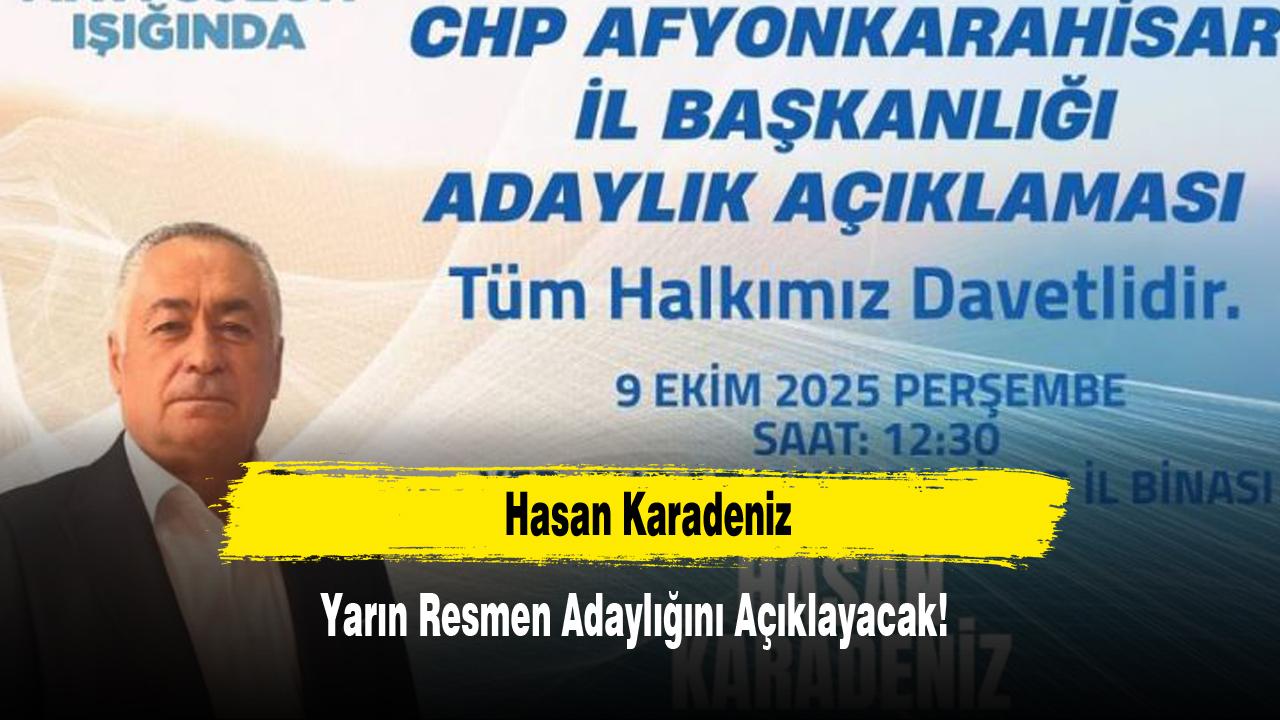 Karadeniz, yarın (9 Ekim Perşembe) saat 12.30’da CHP Afyonkarahisar İl Başkanlığı binasında düzenleyeceği basın toplantısıyla adaylığını kamuoyuna duyuracak.