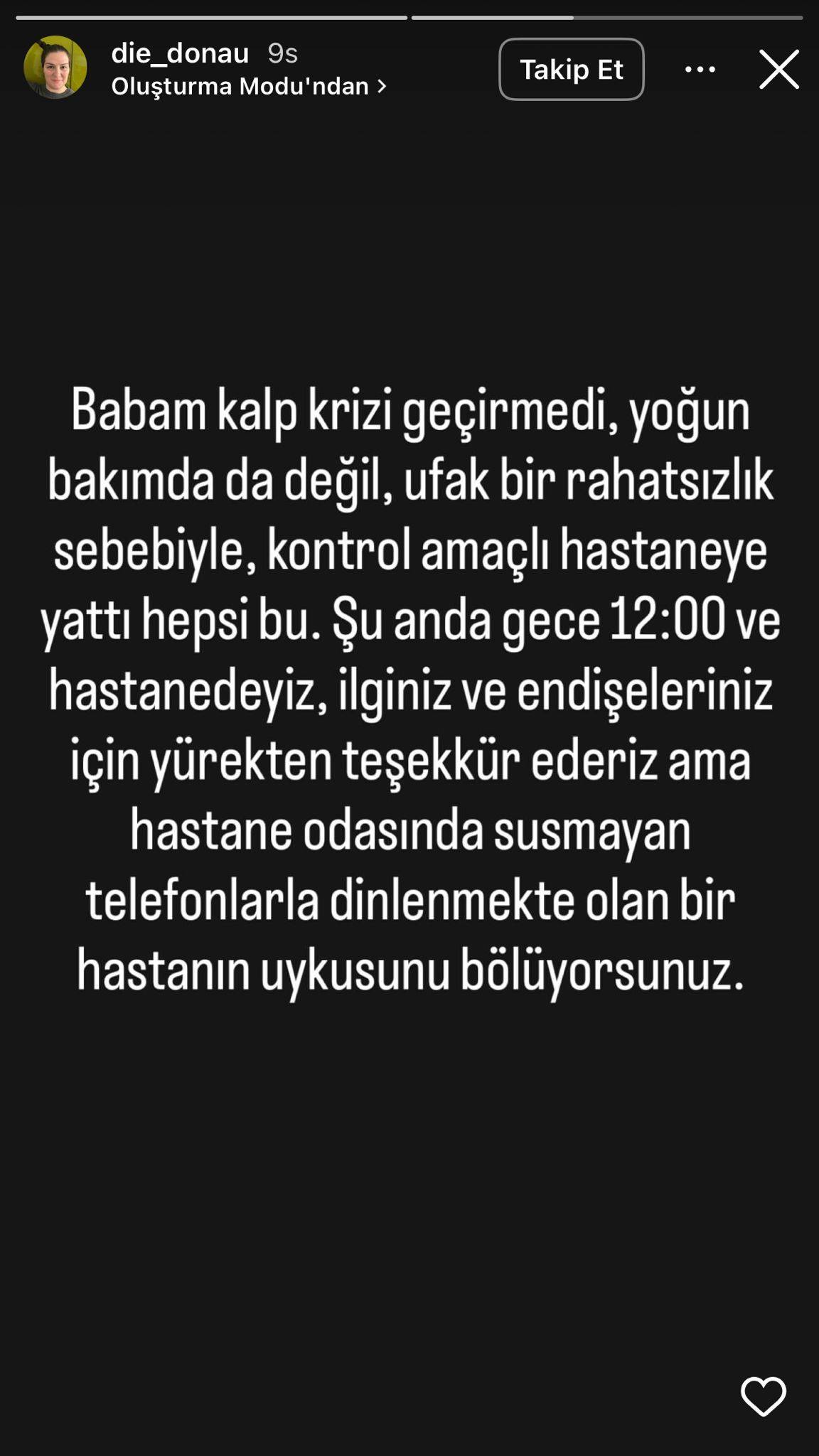 "Babam kalp krizi geçirmedi, yoğun bakımda da değil. Ufak bir rahatsızlık nedeniyle, kontrol amaçlı hastaneye yattı. Şu anda hastanede ve durumunu kontrol ediyoruz. Gece saat 12:00 ve hastanedeyiz. İlginiz için teşekkür ederiz ama hastanın dinlenmesini sağlamak adına telefonlarla sürekli iletişim kurmamanızı rica ediyoruz."
