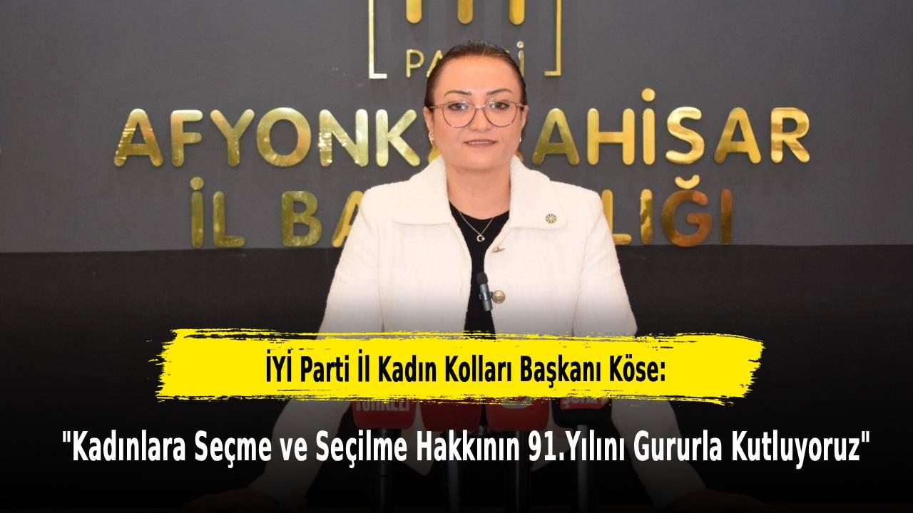 İYİ Parti Afyonkarahisar İl Kadın Kolları Başkanı Aslı Köse, bu anlamlı gün dolayısıyla yaptığı açıklamada, Türk kadınlarının bu 91 yıllık sürede büyük bir yol kat ettiğine ancak hala eşit temsil noktasında eksiklikler bulunduğuna dikkat çekti. Başkan Köse, “Bugün kadınlarımız; üreten, yöneten, mücadele eden ve söz söyleyen bireyler olarak, seçme ve seçilme hakkının ne kadar değerli olduğunu en güçlü şekilde gösteriyorlar. Fakat kadının siyasette ve karar alma mekanizmalarında hak ettiği yerin daha ileri seviyelere taşınması için hala yürünecek bir yolumuz var.” İfadelerine yer verdi.
