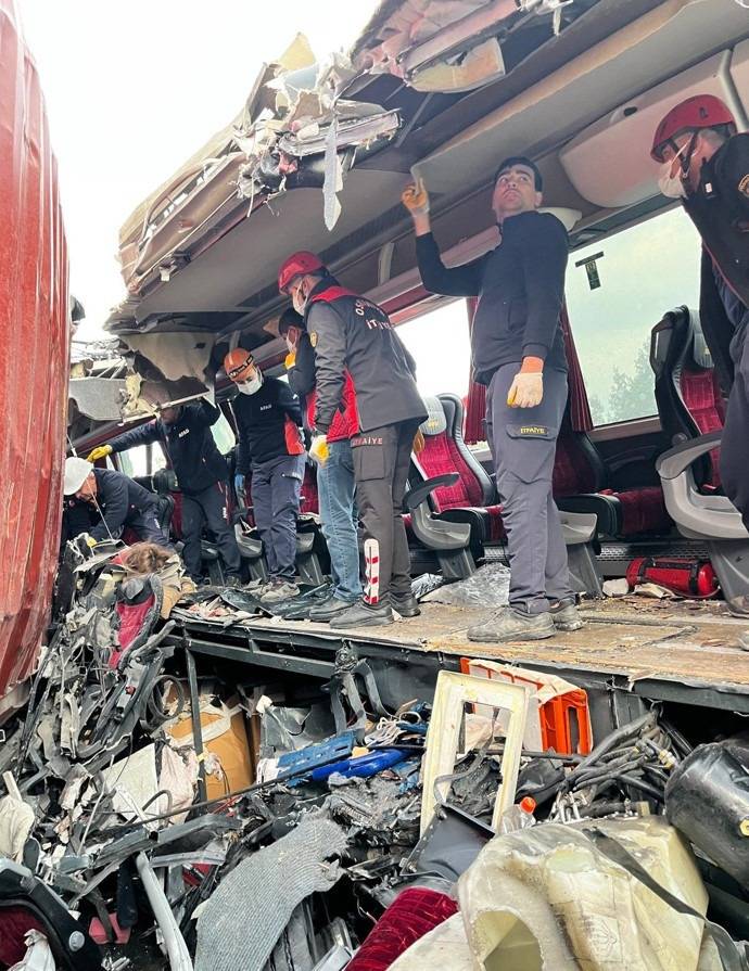 Çarpmanın etkisiyle otobüste büyük hasar meydana geldi. Araç içinde sıkışan yolcuların kurtarılması için olay yerine çok sayıda jandarma, polis, sağlık ve itfaiye ekibi sevk edildi.