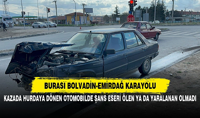 Kaza, Bolvadin-Emirdağ karayolu üzerinde meydana geldi. Edinilen bilgilere göre, H.E., idaresindeki 42 FET 18 plakalı tır Bolvadin Sanayi Sitesi Kavşağında henüz belirlenemeyen bir sebepten ötürü Ş.S., yönetimindeki 26 DA 544 plakalı otomobile çarptı. Çarpmanın etkisi ile savrulan otomobil kavşaktaki refüje çarparak durabildi. Kazada hurdaya dönen otomobilde şans eseri ölen ya da yaralanan olmadı. >>İHA