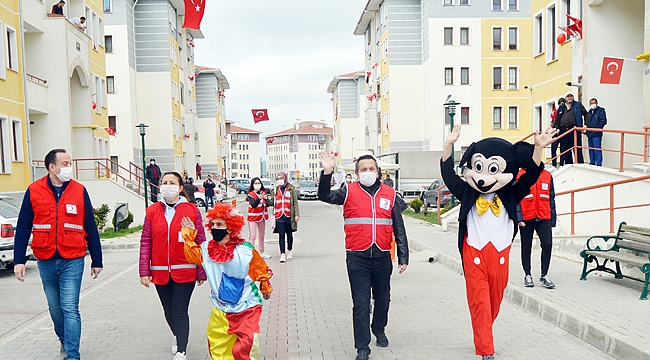 TOKİ Mevlana İlkokul ve Ortaokulu öğretmenleri ile Motorlu Yunus ekipleri de ellerinde Türk bayraklarıyla, sitedeki çocukları selamladı.