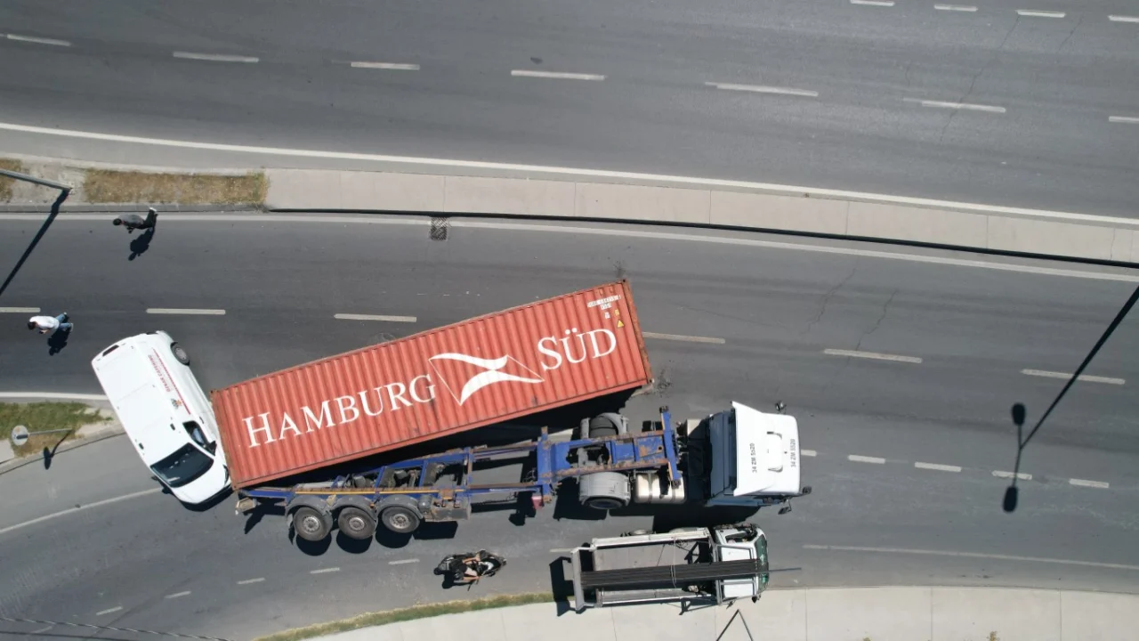 O esnada tırın yanından bir aracın geçmemesi muhtemel bir faciayı önledi. Güvenlik kamerasına yansıyan görüntülerde, kazadan saniyeler önce bir aracın konteynerin devrildiği şeritten geçtiği ardından tırın dönüş yaparken konteynerinin yola düştüğü görüldü.