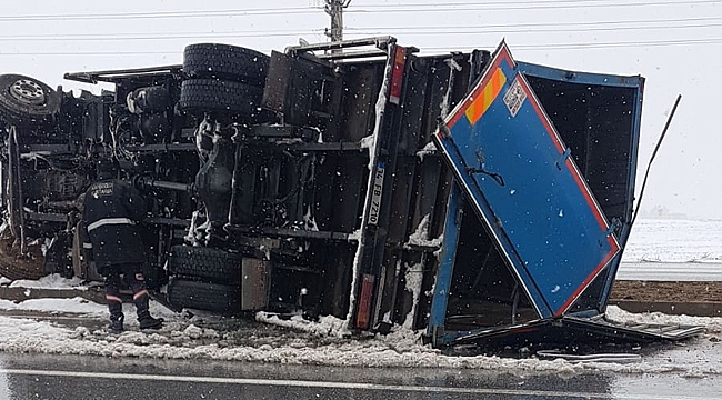 KONTROLDEN ÇIKAN KAMYON DEVRİLDİ