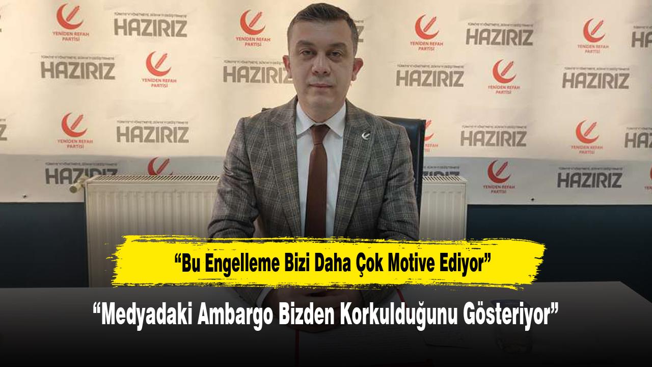 Yeniden Refah Partisi Afyonkarahisar İl Başkanı Fehmi Güray Çakır, partiye yönelik medya engellemelerinin siyasi kaygıdan kaynaklandığını söyleyerek, “Bu ambargo ‘sizden korkuyoruz’ mesajıdır. Sahada görüp parlamamıza müsaade etmek istemiyorlar.” dedi.