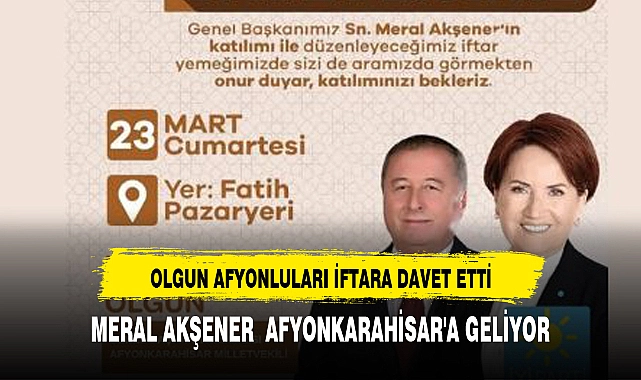 İYİ Parti Genel Başkan Yardımcısı ve Afyonkarahisar Milletvekili Hakan Şeref Olgun bugün düzenlenecek iftar programına Afyonkarahisarlıları davet ederek, "Genel Başkanımız Sayın Meral Akşener, Afyonkarahisar'ımıza teşrif ediyor. Bu anlamlı ziyaret kapsamında düzenlenecek iftar programına tüm hemşerilerimizi davet ediyoruz." Dedi. İYİ Parti tarafından Afyonkarahisar’da düzenlenecek iftar programında Afyonkarahisarlılarla buluşacak Genel Başkan Akşener partililerle birlik ve dayanışma içerisinde olacaklarını belirtirken, adaylarının arkasında olduğunu göstermesi bekleniyor.>>EVREN ATCI