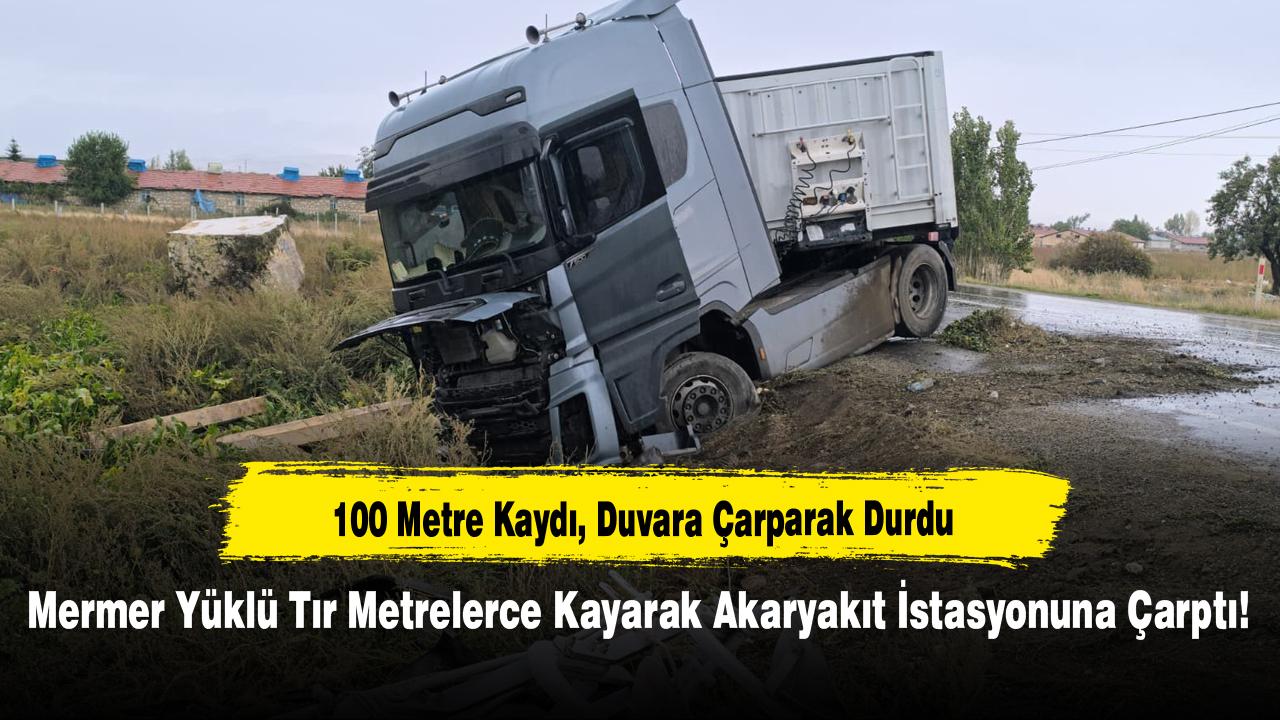 Tonlarca ağırlıktaki mermer blokları taşıyan tır, yaklaşık 100 metre boyunca yol üzerinde kaydıktan sonra, bir akaryakıt istasyonunun istinat duvarına çarparak durabildi. Çarpmanın etkisiyle istinat duvarında hasar oluştu, tırda ise büyük çapta maddi hasar meydana geldi.
