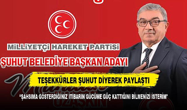 Şuhut ilçesinde 31 Mart 2024 tarihinde gerçekleştirilecek olan mahalli idareler seçimleri için Milliyetçi Hareket Partisi'nin Şuhut Belediye Başkan Adayı olarak belirlenen Muhittin Özaşkın, sosyal medya üzerinden yaptığı duyuruyla hemşehrilerine seslendi. Özaşkın, paylaşımında şu ifadelere yer verdi: "Değerli hemşerilerim, Malumunuz üzere 31 Mart 2024 tarihinde yapılacak mahalli idareler seçimlerinde; Milliyetçi Hareket Partisi Şuhut Belediye Başkan Adaylığı vazifesi şahsıma tevcih edildi. Bu nedenle Genel Başkanımız sayın Dr. Devlet Bahçeli, Milletvekilimiz sayın Mehmet Taytak, il teşkilatımız ve kader arkadaşlığı yapacağımız ilçe teşkilatımıza ayrı ayrı teşekkürlerimi sunuyorum."Devamında Özaşkın, önceki ve sonraki süreçte kendisine destek olan herkese teşekkürlerini iletti. "Yine bu kutlu vazifenin tevcihinden evvel ve sonra; bizlere her ortamda tebrik ve iyi dileklerini ileten herkese ve özellikle siz değerli hemşerilerimede şükranlarımı sunuyorum. Sosyal medya yorumlarınızla, arayarak ya da yüz yüze geldiğimizde ifade ettiğiniz iltifatlarınızla ŞAHSIMA GÖSTERDİĞİNİZ İTİBARIN GÜCÜME GÜÇ KATTIĞINI BİLMENİZİ İSTERİM."iifadelerini kullandı., Şuhut'a en iyi hizmet ve yatırımları kazandırarak hemşehrilerinin gösterdiği ilgiyi karşılamaya hazır olduklarını belirten Muhittin Özaşkın, "Gösterdiğiniz ilgiyi Şuhut’a en iyi hizmet ve yatırımları kazandırarak cevaplayacağımızdan hiç şüphe duymayın. Bu vesileyle tekrar teşekkürlerimi sunuyor, hepinizi Allah’a emanet ediyorum" ifadelerini kullandı.>>EVREN ATCI