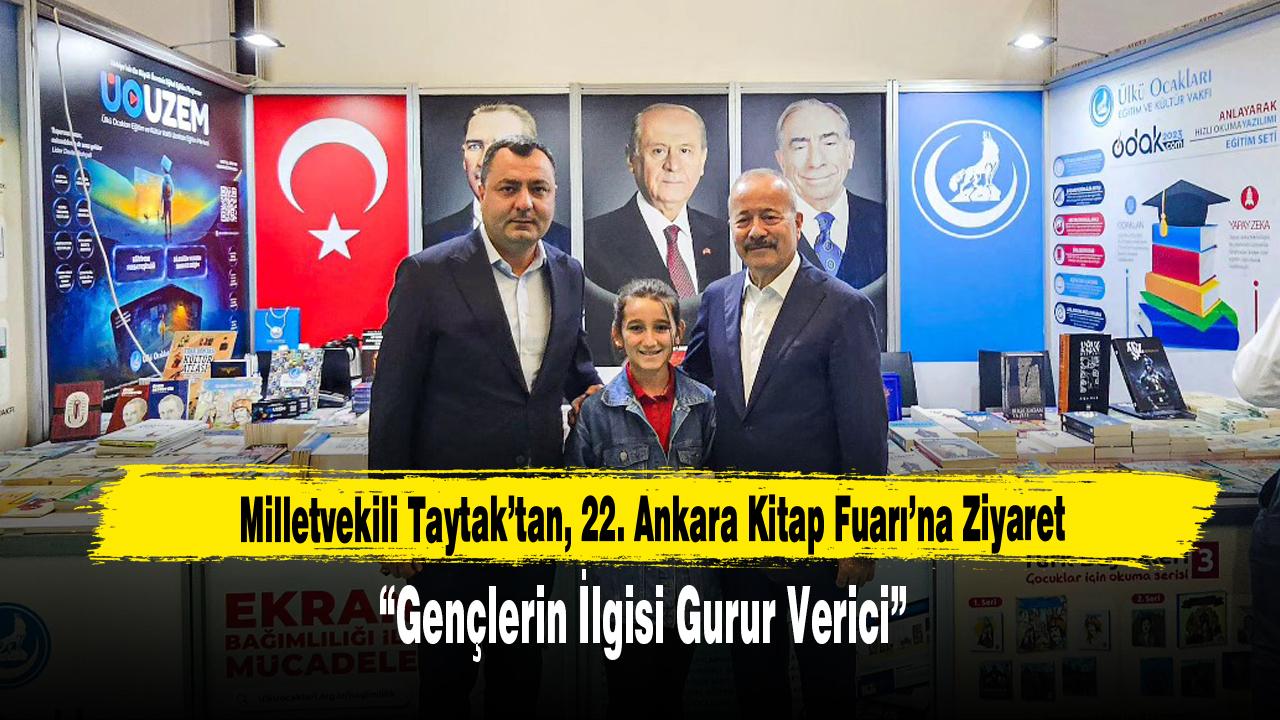 Ziyaretin ardından açıklamalarda bulunan Milletvekili Taytak, “22. Ankara Kitap Fuarı’nda milli ve manevi değerlerimizin genç nesillere aktarılması adına önemli bir görev üstlenen Ülkü Ocakları Ankara İl Başkanlığımızın standını torunum Ağca Selcen ile birlikte ziyaret ettik. Gençlerimizin ve çocuklarımızın yoğun ilgisi bizleri gururlandırdı” ifadelerini kullandı.