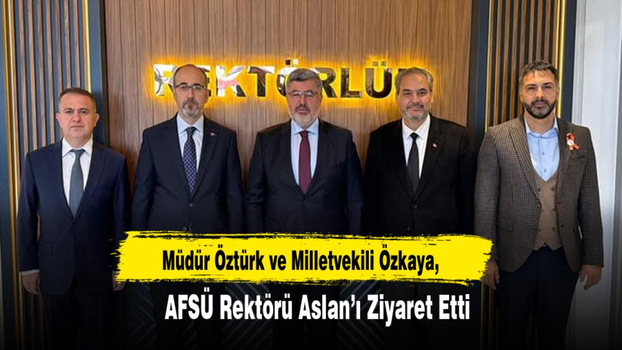Afyonkarahisar İl Sağlık Müdürü Dr. Hakkı Öztürk ve AK Parti Afyonkarahisar Milletvekili Av. Ali Özkaya, Afyonkarahisar Sağlık Bilimleri Üniversitesi (AFSÜ) Rektörü Prof. Dr. Adem Aslan’ı makamında ziyarette bulundu. Gerçekleştirilen ziyarete Afyonkarahisar Sağlık Bilimleri Üniversitesi (AFSÜ) Başhekimi Doç. Dr. Aydın Balcı’da katılım gösterdi.
