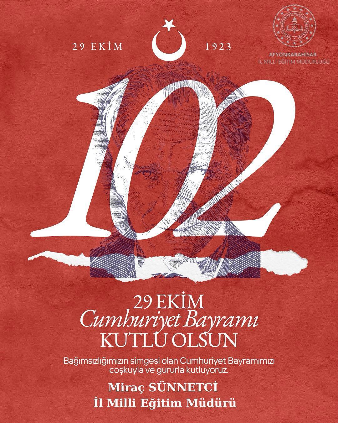 Afyonkarahisar İl Milli Eğitim Müdürü Miraç Sünnetci, 29 Ekim Cumhuriyet Bayramı’nın 102. yıl dönümü dolayısıyla bir kutlama mesajı yayımladı. Sünnetci mesajında, 29 Ekim 1923'ün Türk milletinin yeniden dirilişi ve bağımsızlığının ilanı olduğunu belirterek, Cumhuriyetin yalnızca bir yönetim şekli değil; geçmişten aldığı güçle geleceğe uzanan tarihi bir köprü olduğuna dikkat çekti.