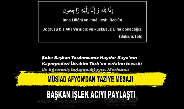 MÜSİAD Afyonkarahisar Şubesi’nden yapılan açıklamada, “Şube Başkan Yardımcımız Haydar Kaya’nın kayınpederi İbrahim Türk’ün vefatını teessür ile öğrenmiş bulunmaktayız. Merhuma Allah’tan rahmet, kederli ailesine sabır ve başsağlığı diliyoruz” ifadelerine yer verildi.