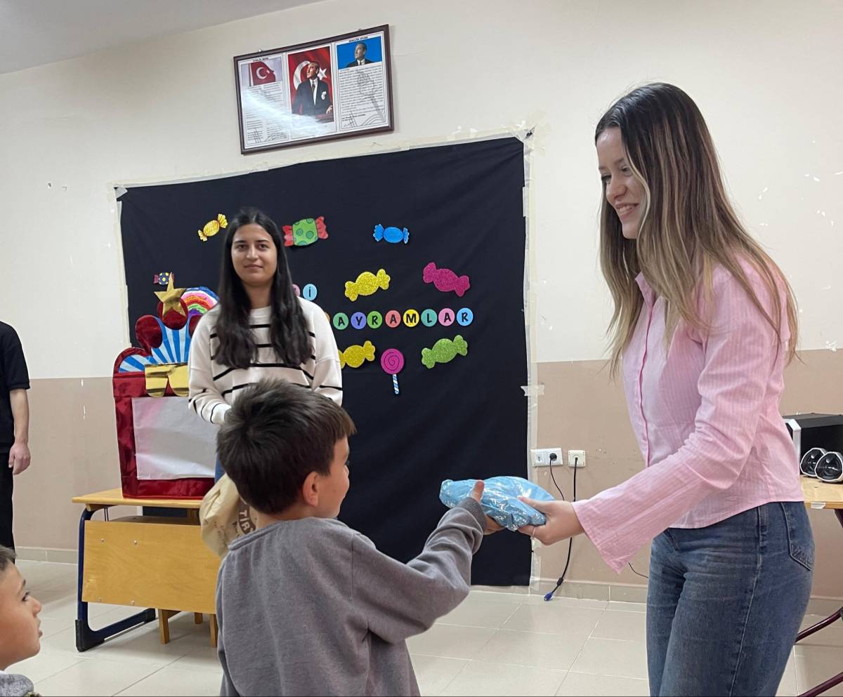 Bacım Sultan Yurdu’nda kalan öğrenciler tarafından Genç Takım ‘Oyun Arkadaşım’ projesi kapsamında örülen bereler, Bostanlı İlkokulu öğrencilerine ulaştırıldı.