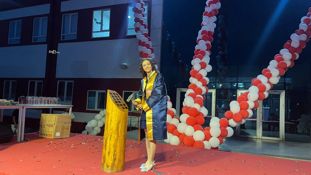 Konuşmasında Okulun ilk günü yaşadıkları heyecanı ve belirsizliği anlatan Tuana Çoban, “Bugün burada lise yolculuğumuzun son durağında, biraz buruk ama bir o kadar da umut dolu duygularla vedalaşmak için toplandık. Her son aslında bir başlangıcın habercisidir. Bizler de bu sonun ardından hayata adım atmaya hazırlanıyoruz,” dedi.