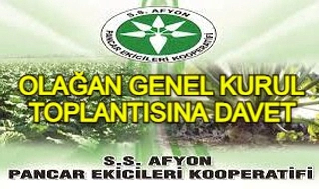 Kooperatifimizin 2021 faaliyet yılına ait 42. Olağan Genel Kurul Toplantısı 15.08.2022 Pazartesi günü saat 09:30’da Kütahya Karayolu 14.Km AFYONKARAHİSAR adresindeki Oruçoğlu Thermal Resort Otelinde aşağıdaki gündemi görüşmek üzere yapılacaktır. Nisap temin edilemediği takdirde ikinci toplantı 31.08.2022 Çarşamba günü saat 09:30’da aynı yerde ve aynı gündemi görüşmek üzere yapılacaktır.