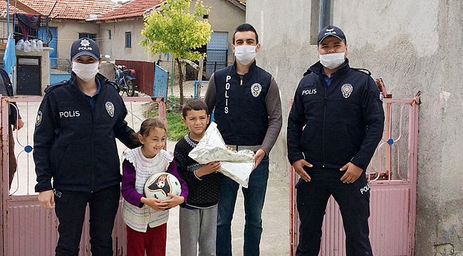 Afyonkarahisar'ın Bayat ilçesinde polis ekipleri, kağıttan yaptıkları topla oynadıklarını gördükleri iki çocuğa, futbol topu ve çeşitli oyuncaklar hediye etti.