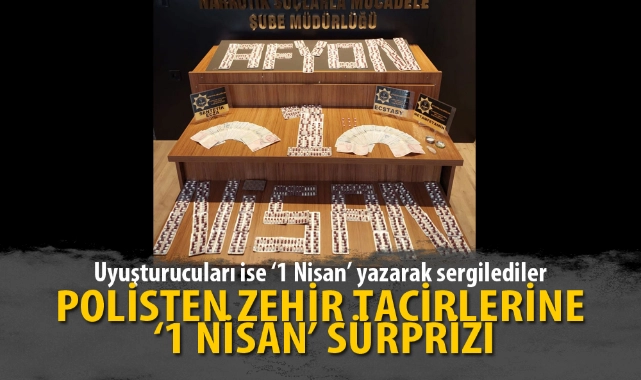 Edinilen bilgilere göre, İl Emniyet Müdürlüğüne bağlı Narkotik Suçlarla Mücadele Şube Müdürlüğü ekipleri Afyonkarahisar-Uşak karayolunda oluşturulan uygulama noktasında bir aracı durdurdu. Araçta bulunan biri yabancı uyruklu iki kişinin hareketlerinden şüphelenen ekipler ardından otomobilde arama yaptı. Aramada bin 931 adet sentetik ecza diye adlandırılan uyuşturucu hap, 9 adet extasy hap, 8,32 gram metamfetamin ve 4 bin 900 TL suçtan elde edildiği değerlendirilen para ele geçirdi. Ekipler sonrasında R.D., ile yanında bulunan yabancı uyruklu E.H.’yi gözaltına aldı. Şüphelilerin emniyetteki işlemleri devam ederken, polis ekipleri ele geçirdikleri uyuşturucularla ‘1 Nisan’ yazarak sergiledi. >>İHA