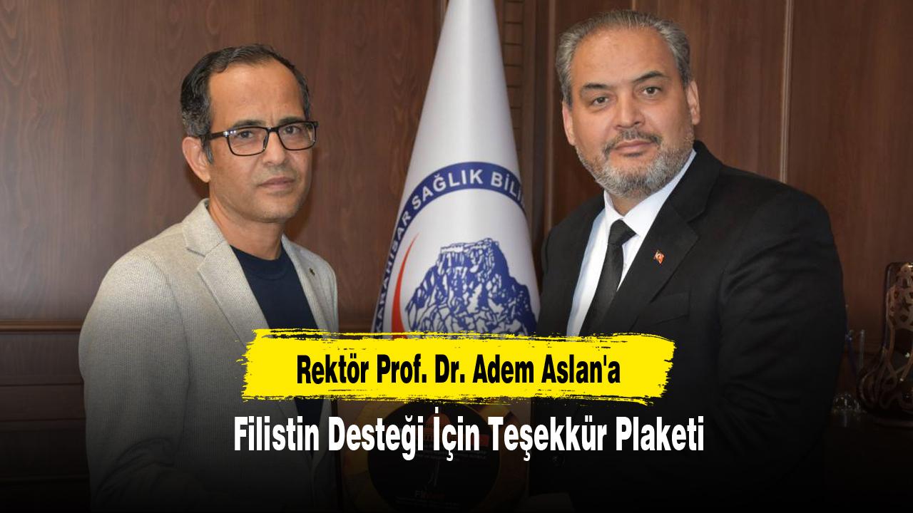 Afyonkarahisar Sağlık Bilimleri Üniversitesi (AFSÜ) Rektörü Prof. Dr. Adem Aslan, Filistinli Tabipler ve Sağlık Mensupları Derneği (Palmed) tarafından üniversitenin Filistin davasına verdiği destek nedeniyle sunulan teşekkür plaketini kabul etti.