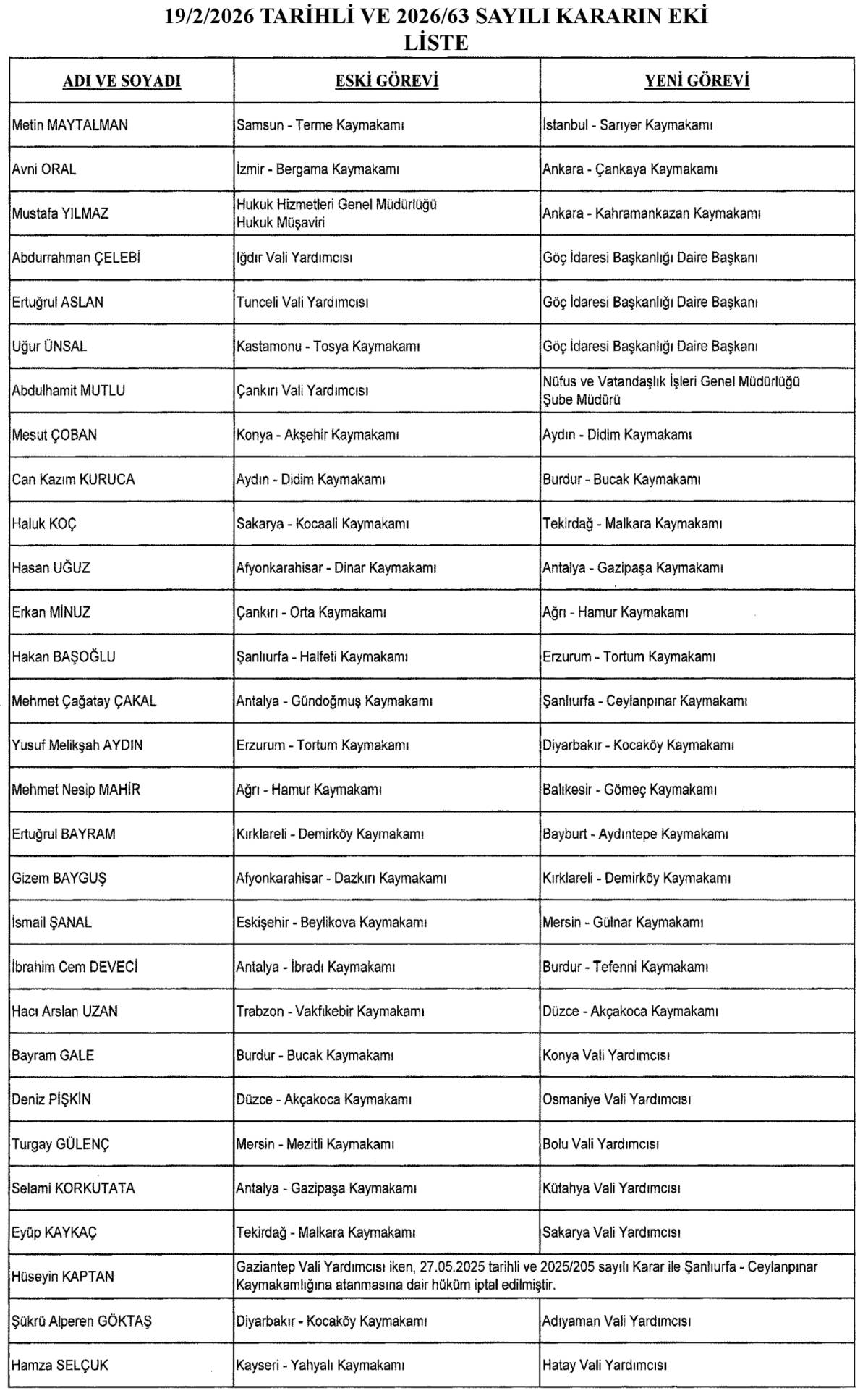 Resmi Gazete’nin 20 Şubat 2026 tarihli yayımlanan karar doğrultusunda, kaymakamlar, vali yardımcıları ve kaymakam adaylarının görev yerleri değiştirildi. Cumhurbaşkanı Recep Tayyip Erdoğan’ın imzasıyla yayımlanan 2026/63 sayılı karar kapsamında çok sayıda kaymakam, vali yardımcısı ve kaymakam adayının görev yeri değiştirildi. Atama listesi Resmi Gazete’de yayımlandı.