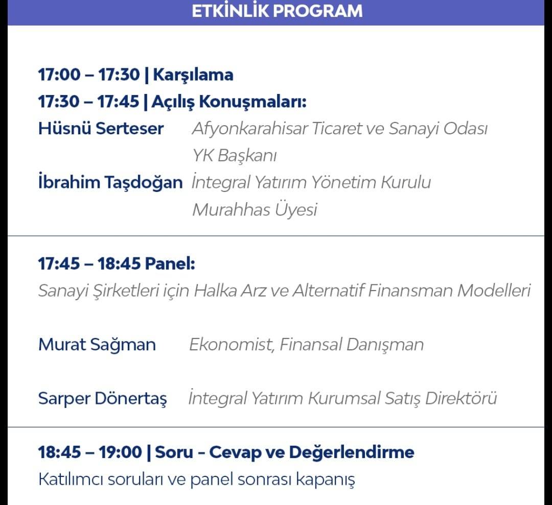 Panelde, Ekonomist ve Finansal Danışman Murat Sağman ile İntegral Yatırım Kurumsal Satış Direktörü Sarper Dönertaş konuşmacı olarak yer alacak. Finans dünyasının deneyimli isimleri, halka arz stratejileri, alternatif finansman yöntemleri ve sermaye piyasalarındaki güncel gelişmeler hakkında katılımcılara kapsamlı bilgiler sunacak.