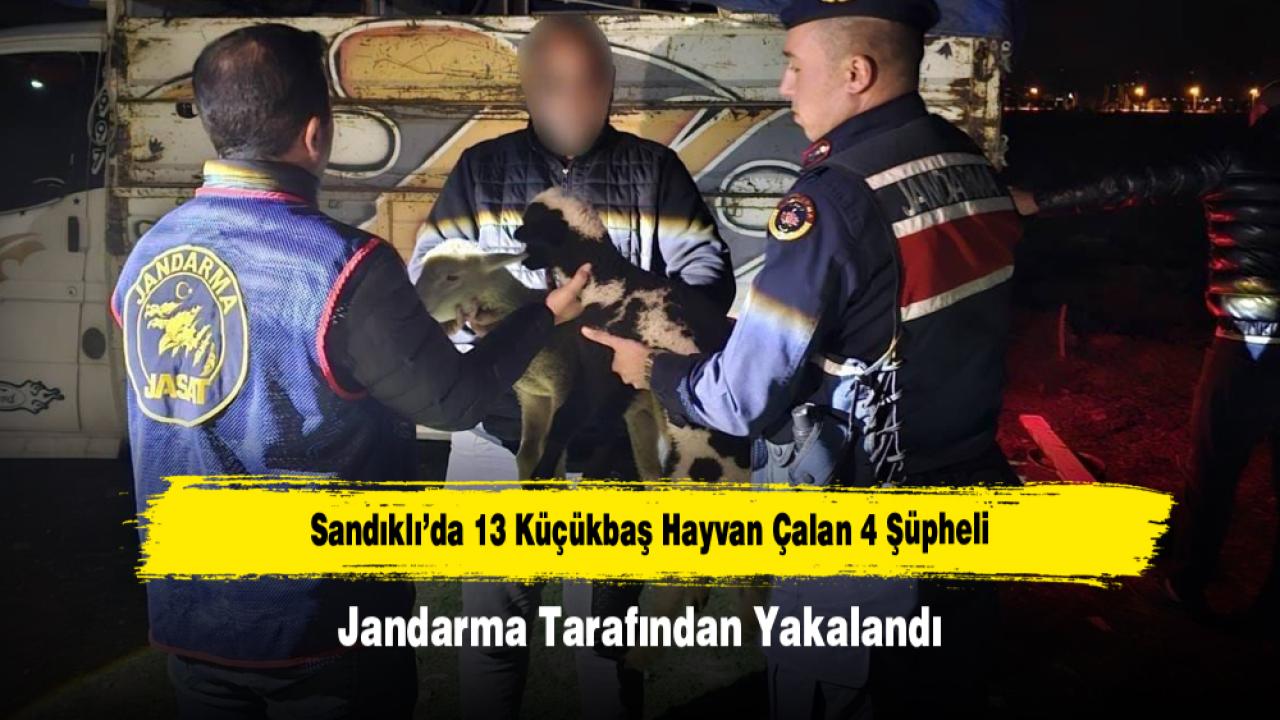 Afyonkarahisar İl Jandarma Komutanlığınca Sandıklı ilçesinde meydana gelen 13 adet küçükbaş hayvan hırsızlığı olayı kısa sürede çözüldü. Jandarma dedektifleri (JASAT) tarafından yürütülen titiz çalışmalar neticesinde olaya karışan 4 şüpheli şahıs tespit edilerek yakalandı.