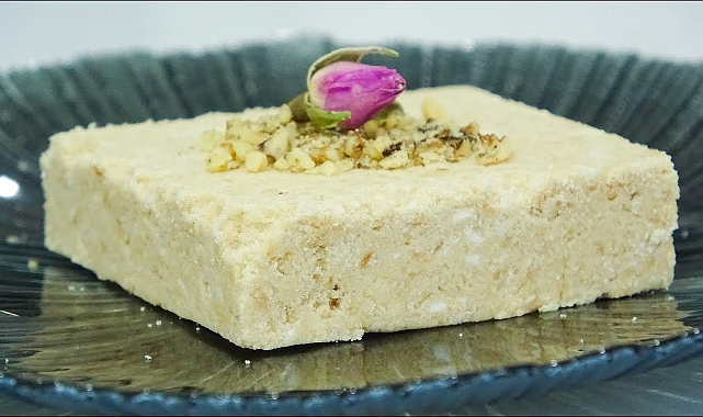 Helvayı devamlı karıştırın. Kumlu yoğun bir kıvamı olacak biraz kol gücü de kullanarak helvayı iyice karıştırın. Helvayı borcam tepsiye dökün. Spatula ile bastırın, altı düz bir bardakla sıkıştırıp üzerini düzleştirin. Dilimleyip üzerine streç film çekip buzdolabına kaldırın.