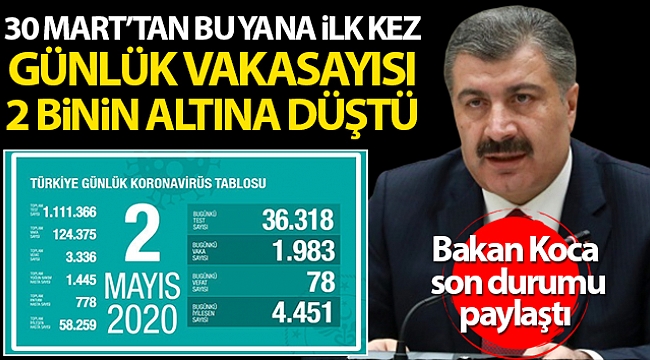 Son Dakika Haberi: Sağlık Bakanı Fahrettin Koca, Türkiye'deki 2 Mayıs tarihine ait son coronavirüs vaka ve vefat sayısını açıkladı. Bakan Koca'nın açıklamasına göre bugün Türkiye'de 1983 yeni vaka tespit edildi, 78 kişi ise hayatını kaybetti. Bugün Türkiye'de iyileşen sayısı 4451 oldu ve toplam iyileşen hasta sayısı 58.259 oldu. Bakan Koca, Twitter hesabından yaptığı açıklamada 30 Mart tarihinden sonra ilk kez vaka sayısının 2 binin altına düştüğünü açıkladı.