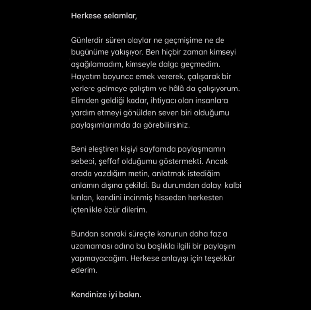 Olayla ilgili olarak sosyal medya üzerinden bir açıklama yapan Bedri Usta ise paylaşım nedeniyle tepki alan kişilerden özür diledi. Yapılan paylaşımın amacının ‘şeffaf olmak’ olduğunu belirten Aydoğdu, “Hiçbir zaman kimseyi aşağılamadım, kimseyle dalga geçmedim. Yazdığım metin anlatmak istediğim anlamın dışına çekildi. Bu durumdan dolayı kırılan, incinen herkesten içtenlikle özür dilerim” ifadelerini kullandı.