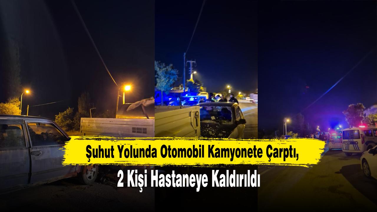 Kaza, Şuhut ilçesi girişinde meydana geldi. Edinilen bilgiye göre, H.F. yönetimindeki 03 SL 922 plakalı otomobil, henüz bilinmeyen bir nedenle aynı istikamette seyreden F.Ö. idaresindeki 03 RK 385 plakalı kamyonete arkadan çarptı. Çarpmanın etkisiyle otomobilde bulunan 2 kişi yaralandı.